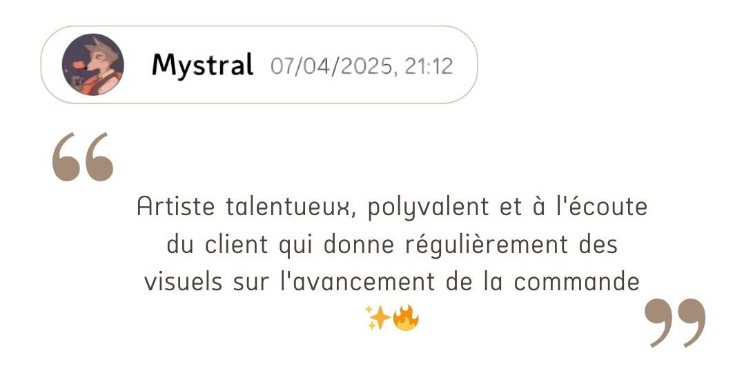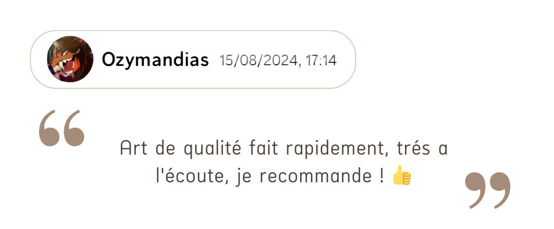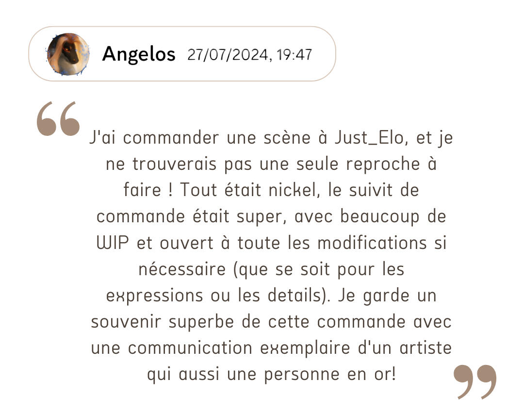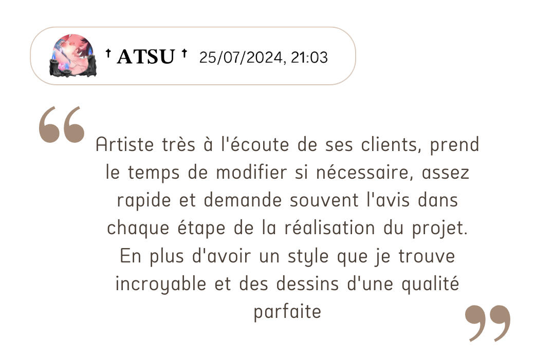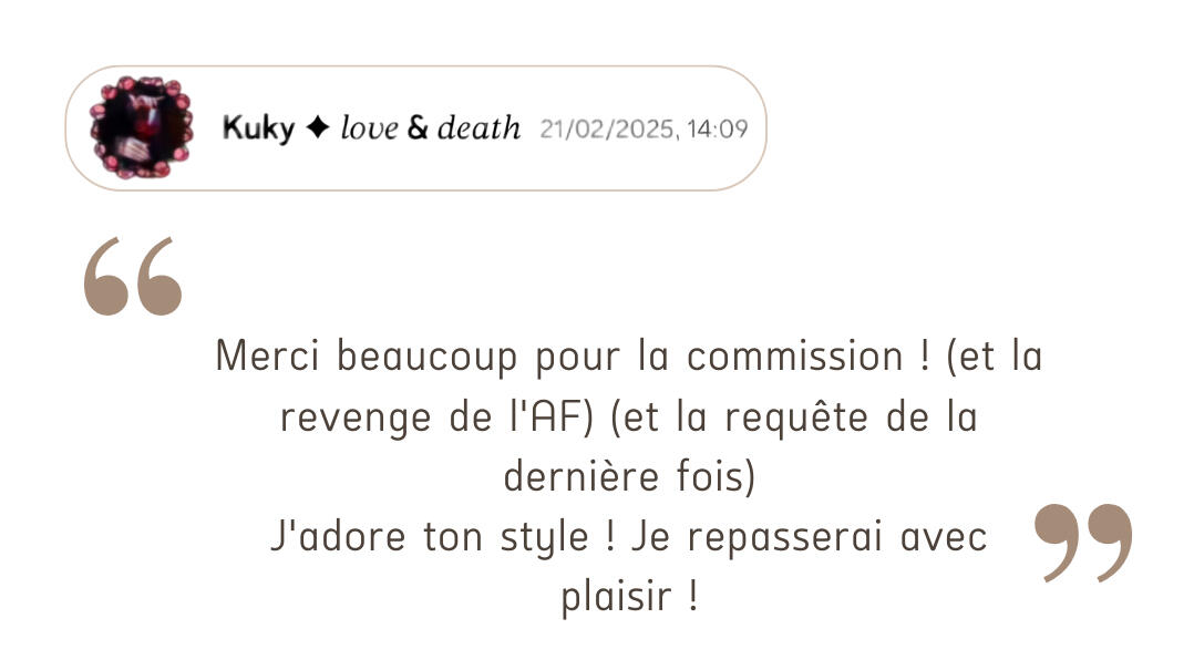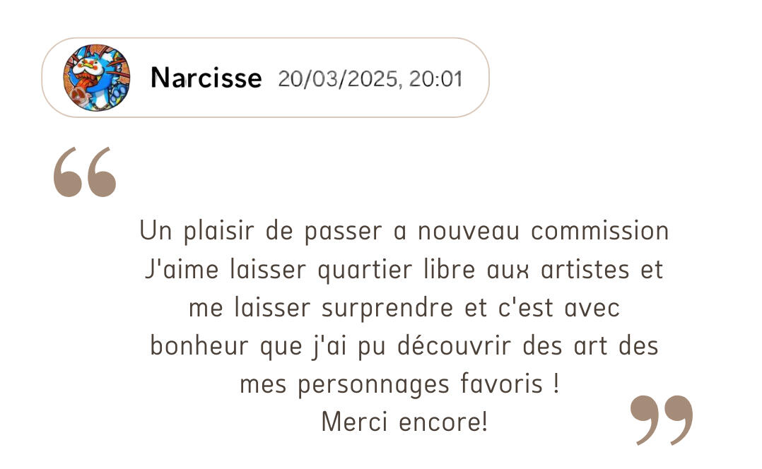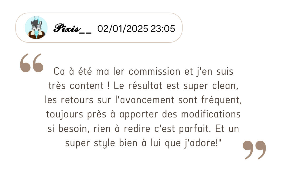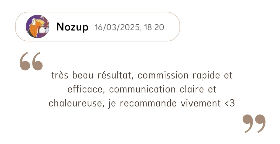 Vous pouvez passer commande directement par message sur l'un de mes réseaux ou par mail. Les informations contractuelles sont présentées en langue française et font l’objet d’une confirmation au plus tard au moment de la validation de votre commande [Facture récapitulative de commande incluant une courte description/le prix de votre commande].Afin de permettre le meilleur déroulement possible, il vous sera demander de fournir une ou plusieurs images de références récentes et/ou actuelles de votre personnage.