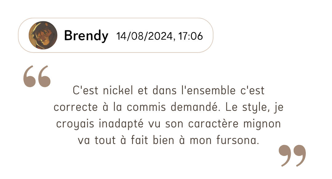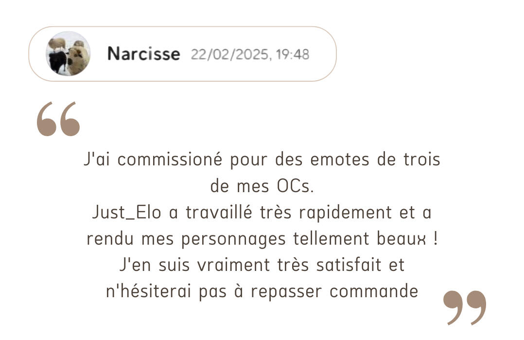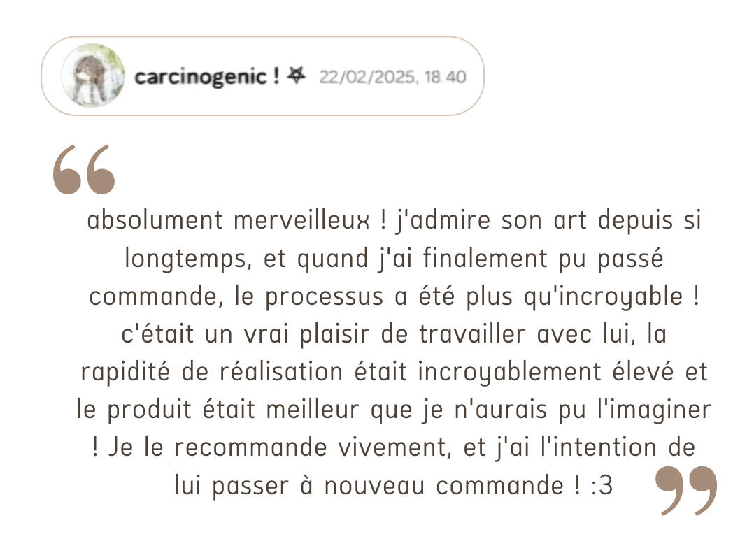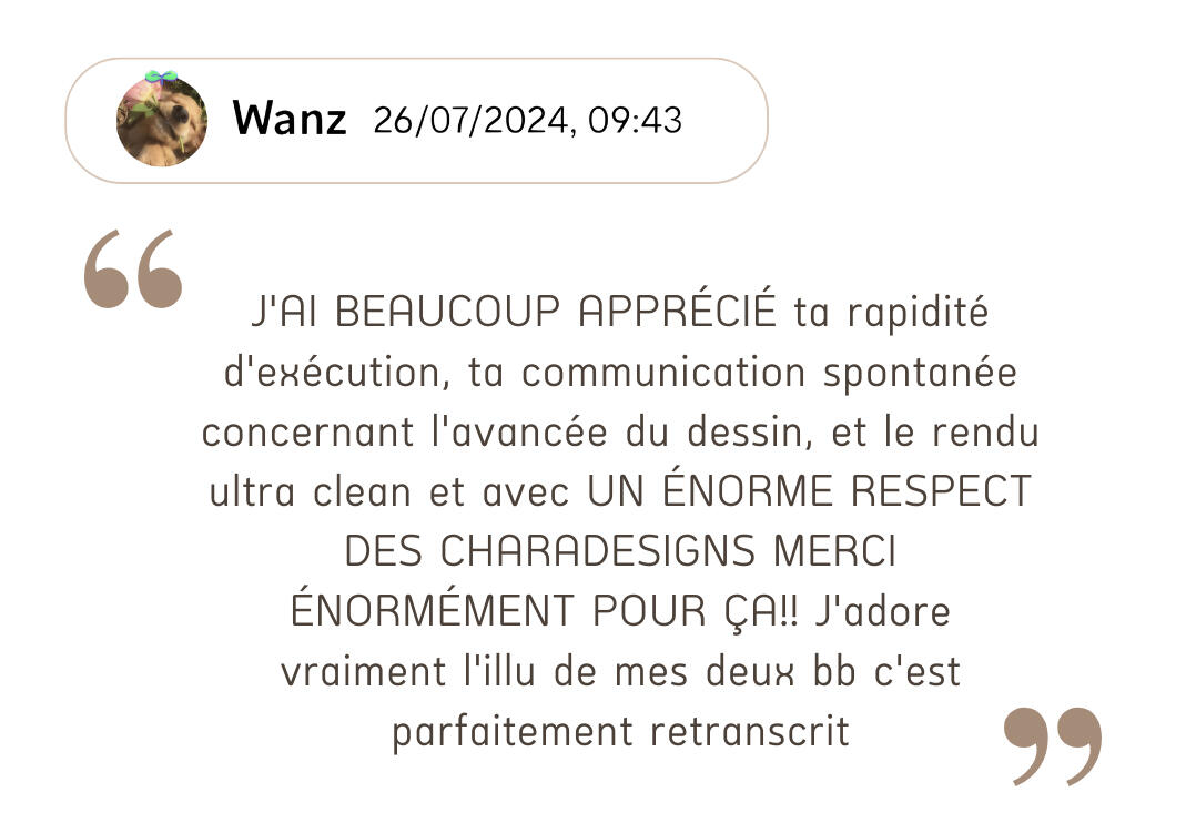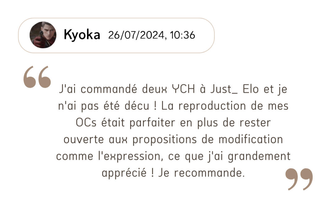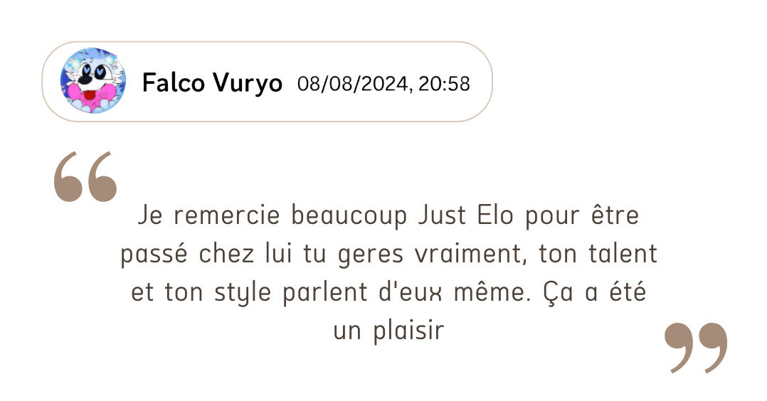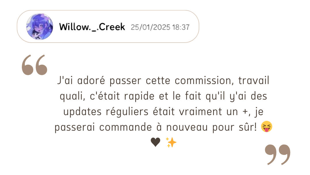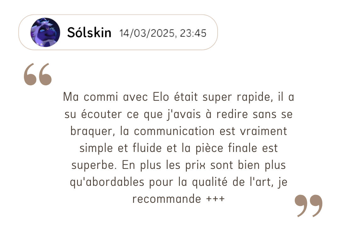 Vous pouvez passer commande directement par message sur l'un de mes réseaux ou par mail. Les informations contractuelles sont présentées en langue française et font l’objet d’une confirmation au plus tard au moment de la validation de votre commande [Facture récapitulative de commande incluant une courte description/le prix de votre commande].Afin de permettre le meilleur déroulement possible, il vous sera demander de fournir une ou plusieurs images de références récentes et/ou actuelles de votre personnage.