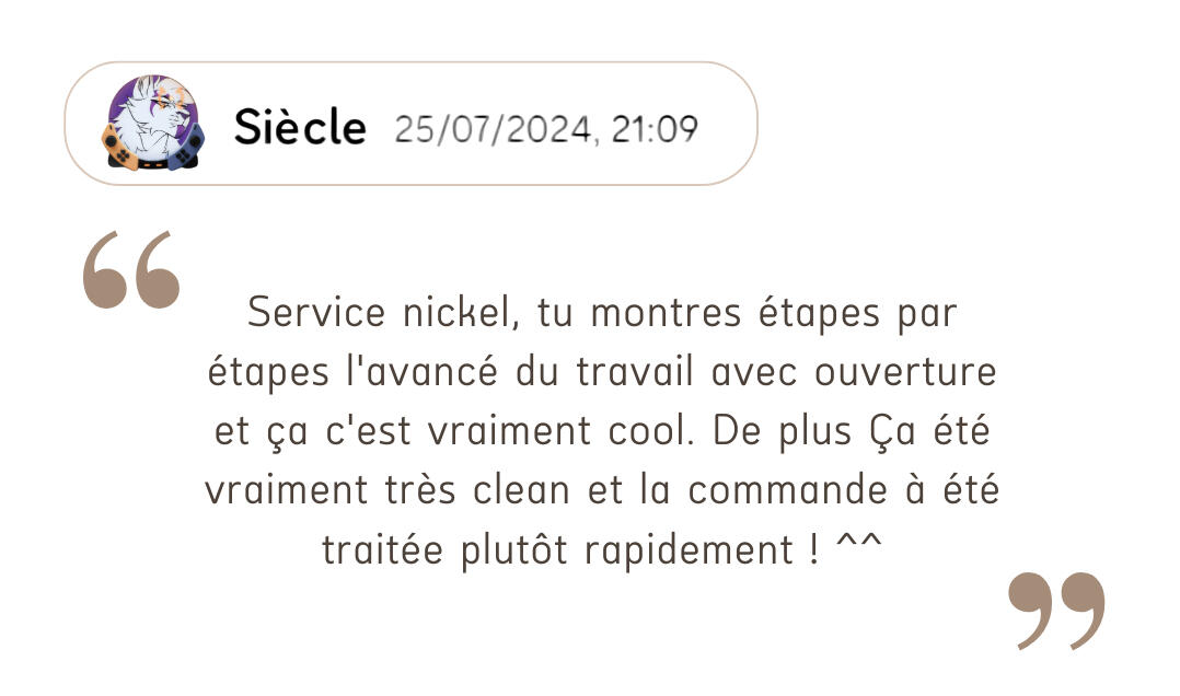 Des images de l'avancée de votre commande vous seront envoyées tout au long du processus de création, vous permettant ainsi de demander des modifications tout au long du processus. C'est pour cette raison que dés lors que la commande est terminés vous ne pourrez pas être remboursé ou bénéficier d’une réduction de prix conformément à l'article 6.3.