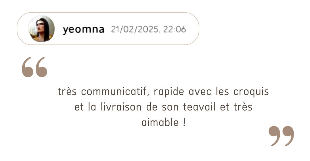 Les tarifs ne sont pas négociables et nous ne sommes pas responsable si un problème survient lors de la transaction.5.1 Demande d'ajouts après le payement initialDans le cas où une demande d'ajout à votre commande, impactant le prix de celle-ci, est effectuée après le payement initial, et ce peu importe l'étape du processus de réalisation, un payement supplémentaire équivalent à la valeur de l'ajout vous sera demandé, sans quoi aucun de ces dit ajouts ne sera effectué.5.2 Demande de modifications après le payement initialDans le cas où une demande de modification, impactant le rendu préalablement prévu de votre commande, est réalisée après la validation préalable du croquis, un payement supplémentaire équivalent à la valeur de la modification vous sera demandé, sans quoi aucune de ces dites modifications ne seront effectuées.
